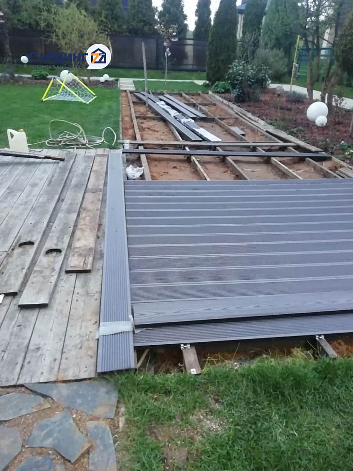 Монтаж террасной доски D-PLAST на металлический каркас. Внешняя Сторона полов Вельвет. Подступень Дерево. Московская область.